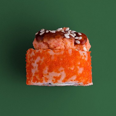 Состав: снежный краб, сливочный сыр, омлет, икра масаго, яки соус, унаги соус, кунжут.