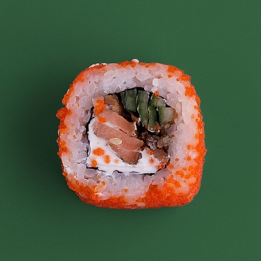 Состав: лосось в соусе терияки, сливочный сыр, огурец, икра масаго оранжевая, кунжут.