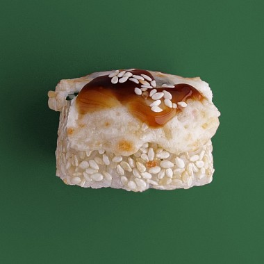 Состав: сливочный сыр, айсберг, кунжут, сыр моцарелла, лук зеленый, сливки, унаги соус, кунжут.