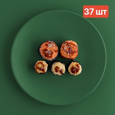Состав: лосось, сырный соус, унаги соус, кунжут. Два соуса - унаги и сырный идеально соче...